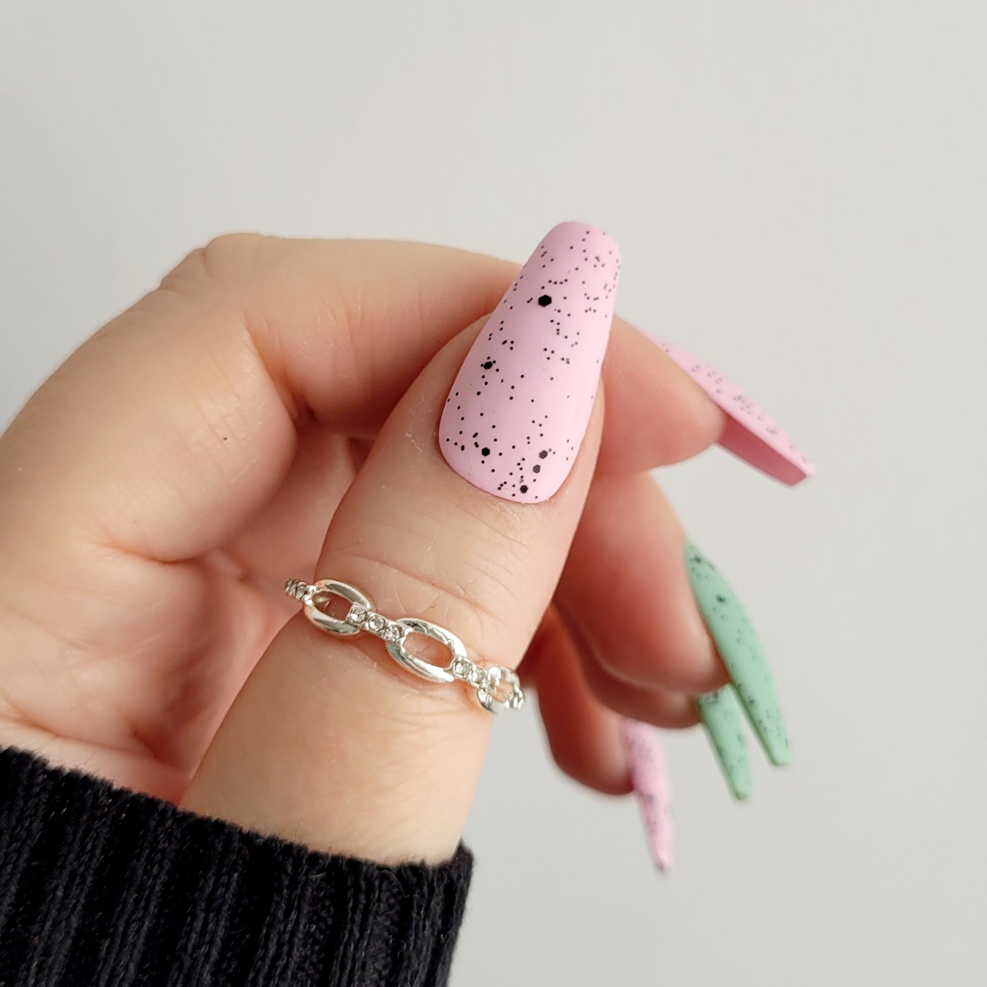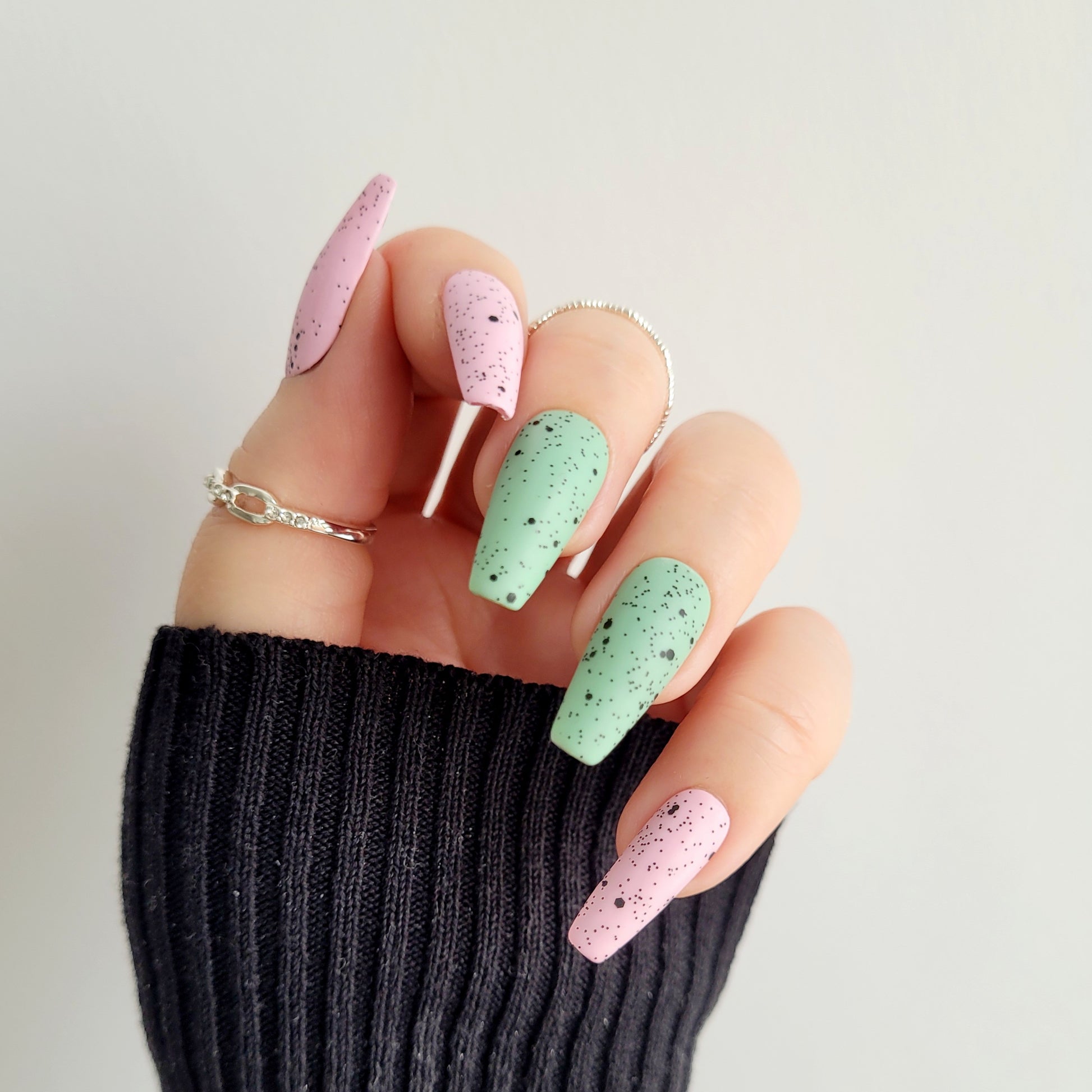Kynsien väri pastelli vaaleanpunainen ja pastelli minttu (eggshell efektillä).