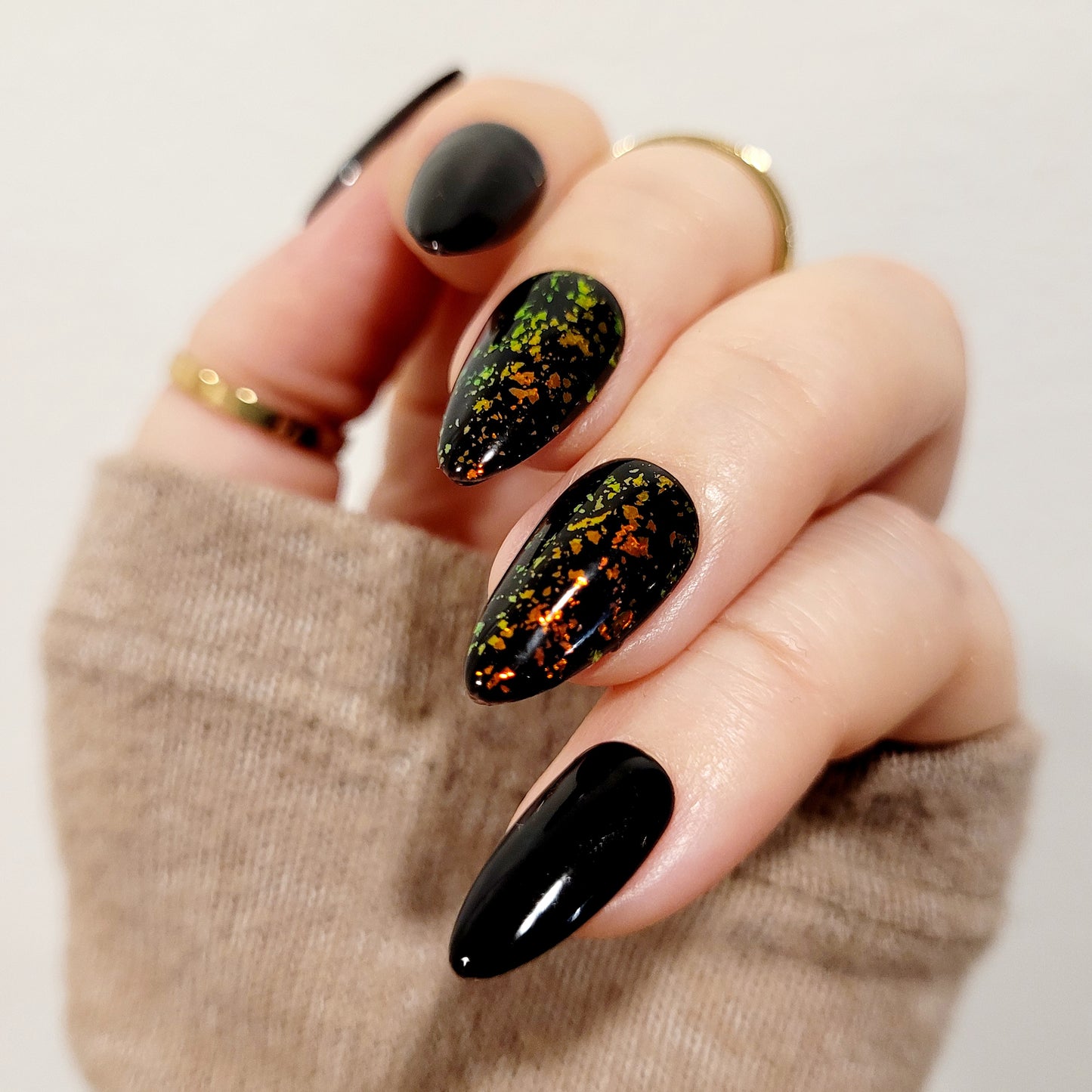 Kynsien värit musta ja oranssi-keltainen-vihreä flakie. Flakie kynnet vaihtavat väriä oranssista vihreään katselukulmasta riippuen.