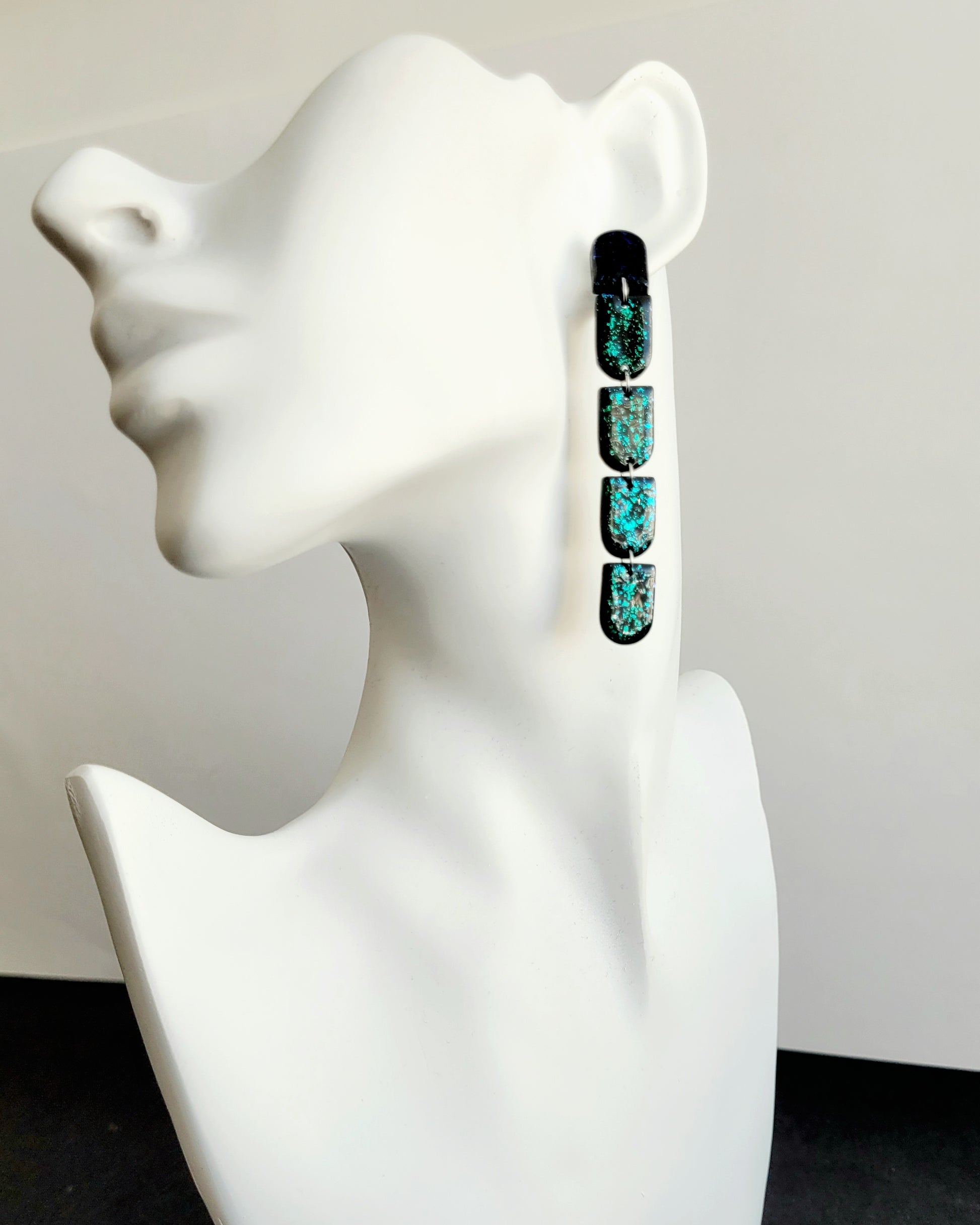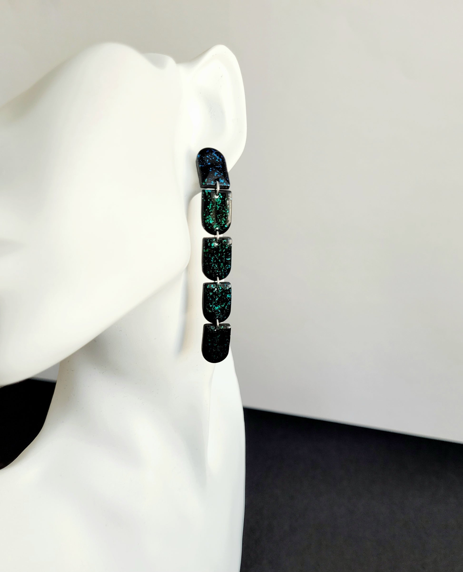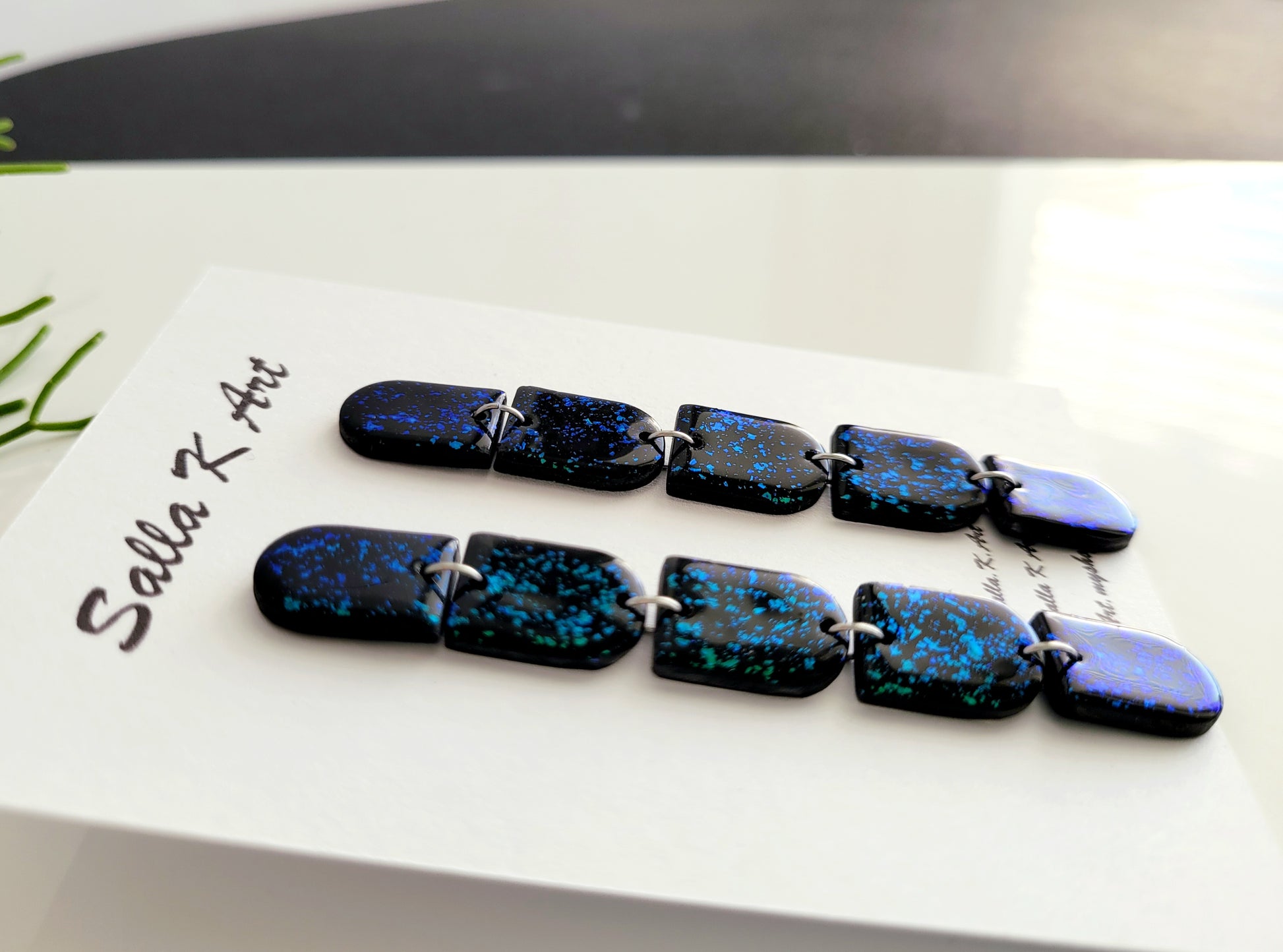 Korvakorujen väri musta & merellinen sinivihreä flakie. Flakiet vaihtavat väriä sinisestä vihreään katselukulmasta riippuen. Täydellinen pari Little Mermaid press-on kynsille.