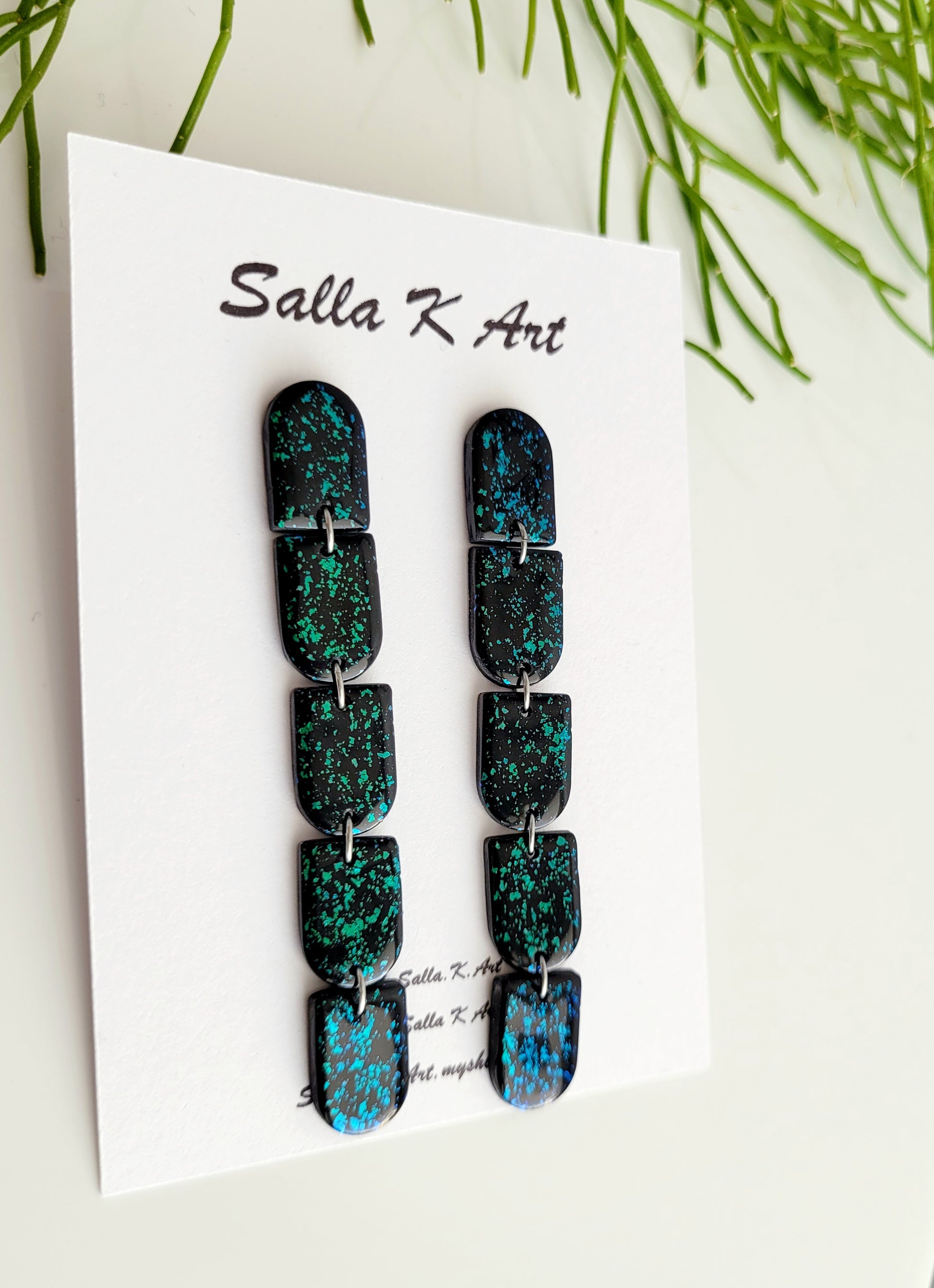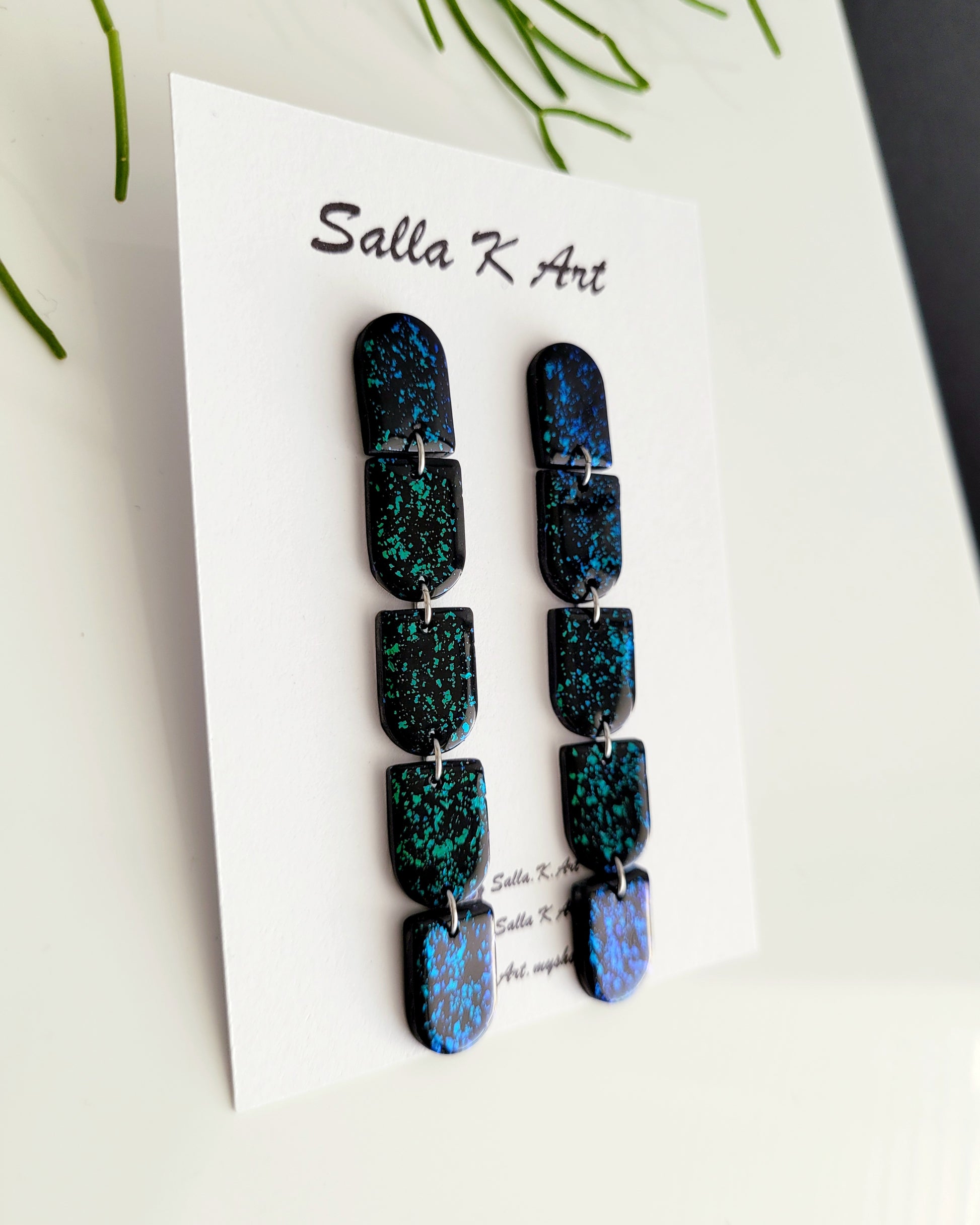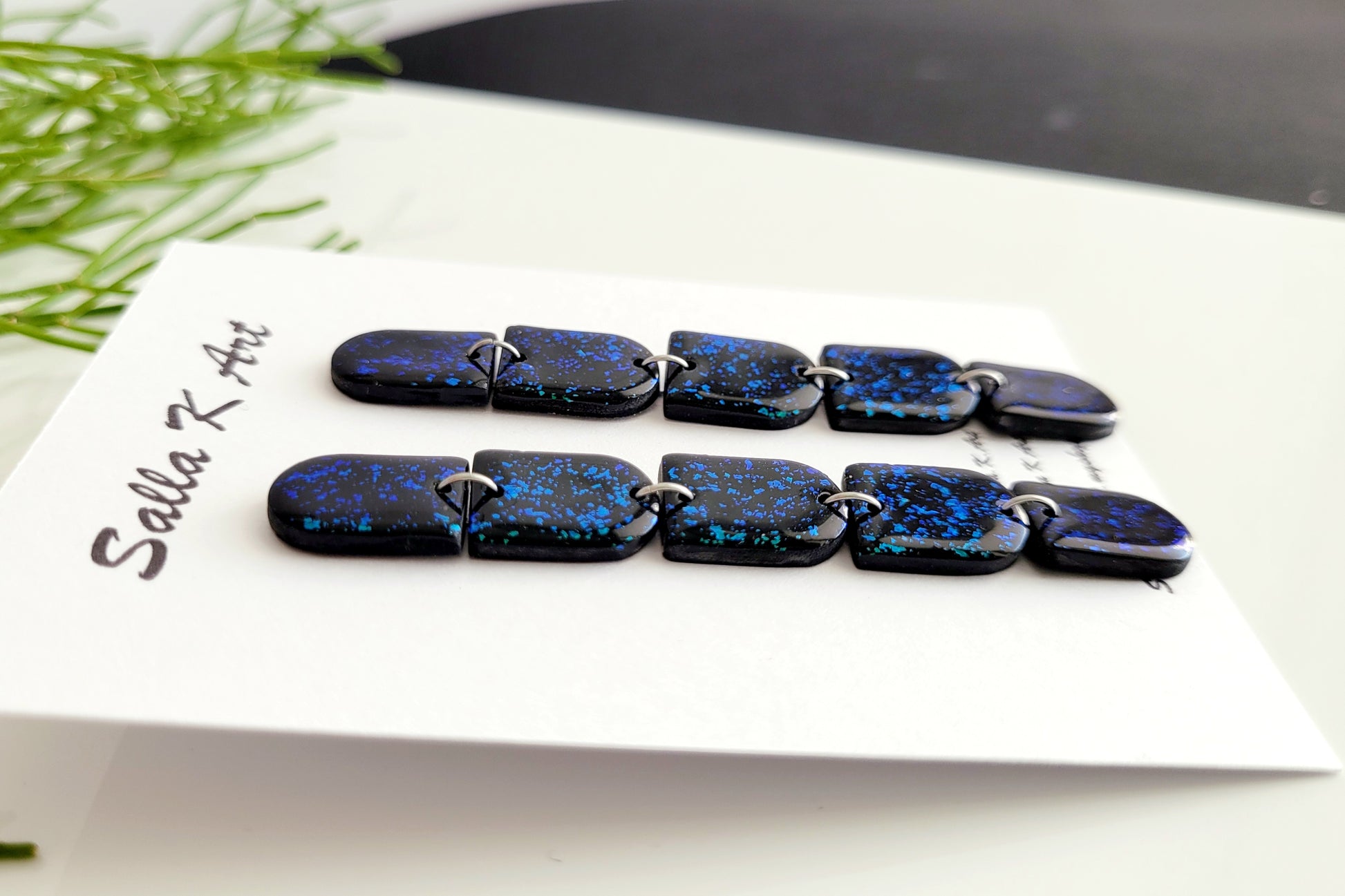 Korvakorujen väri musta & merellinen sinivihreä flakie. Flakiet vaihtavat väriä sinisestä vihreään katselukulmasta riippuen. Täydellinen pari Little Mermaid press-on kynsille.