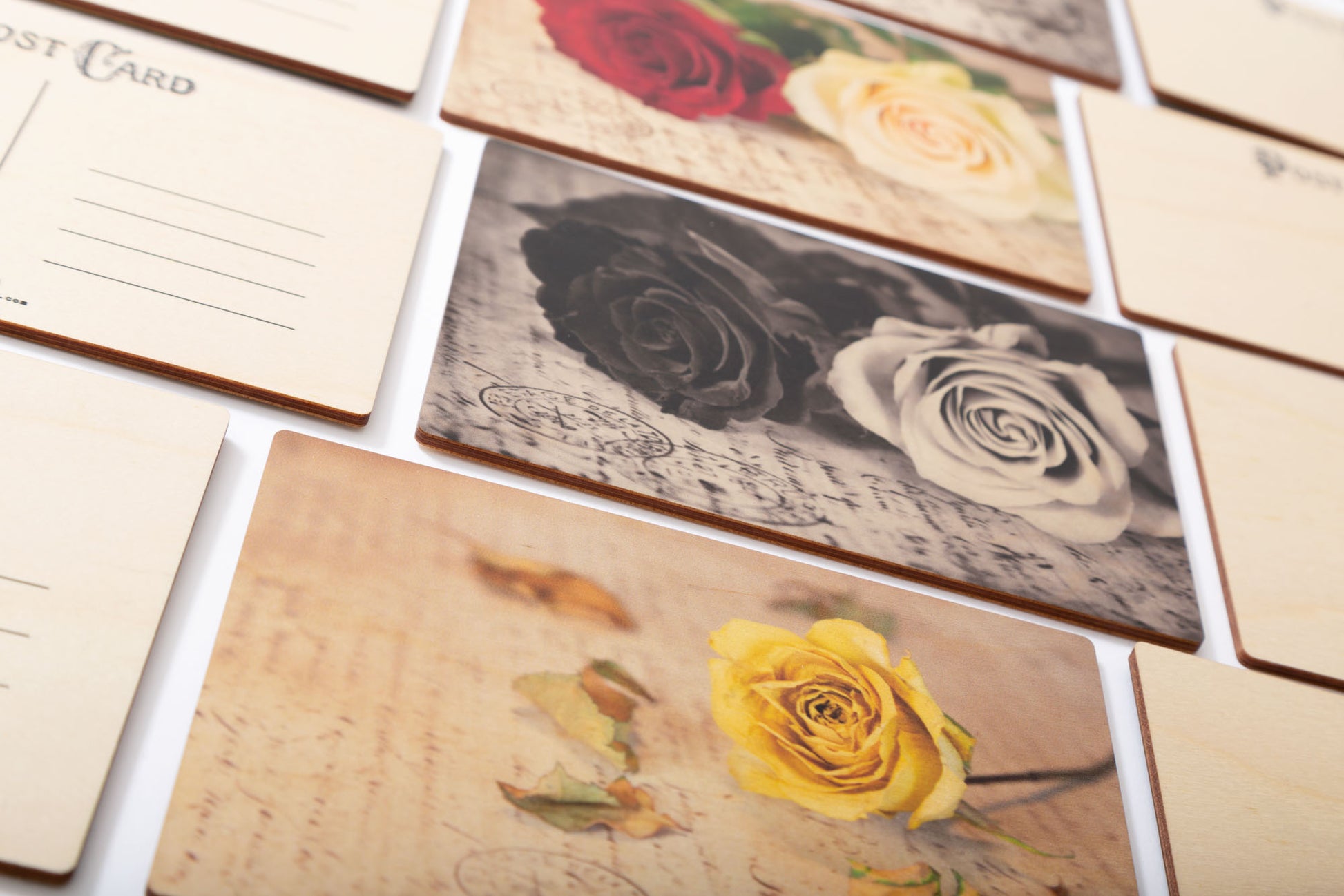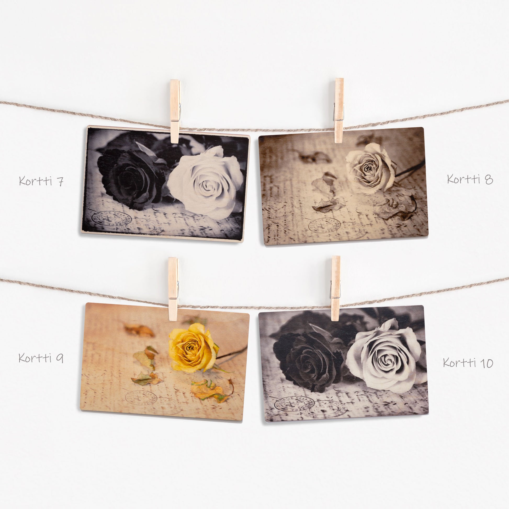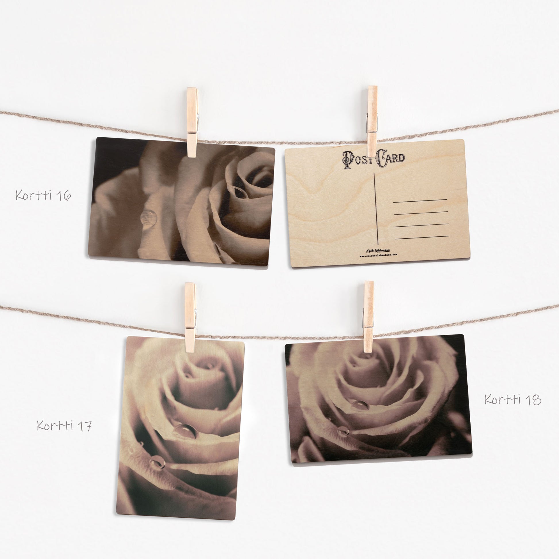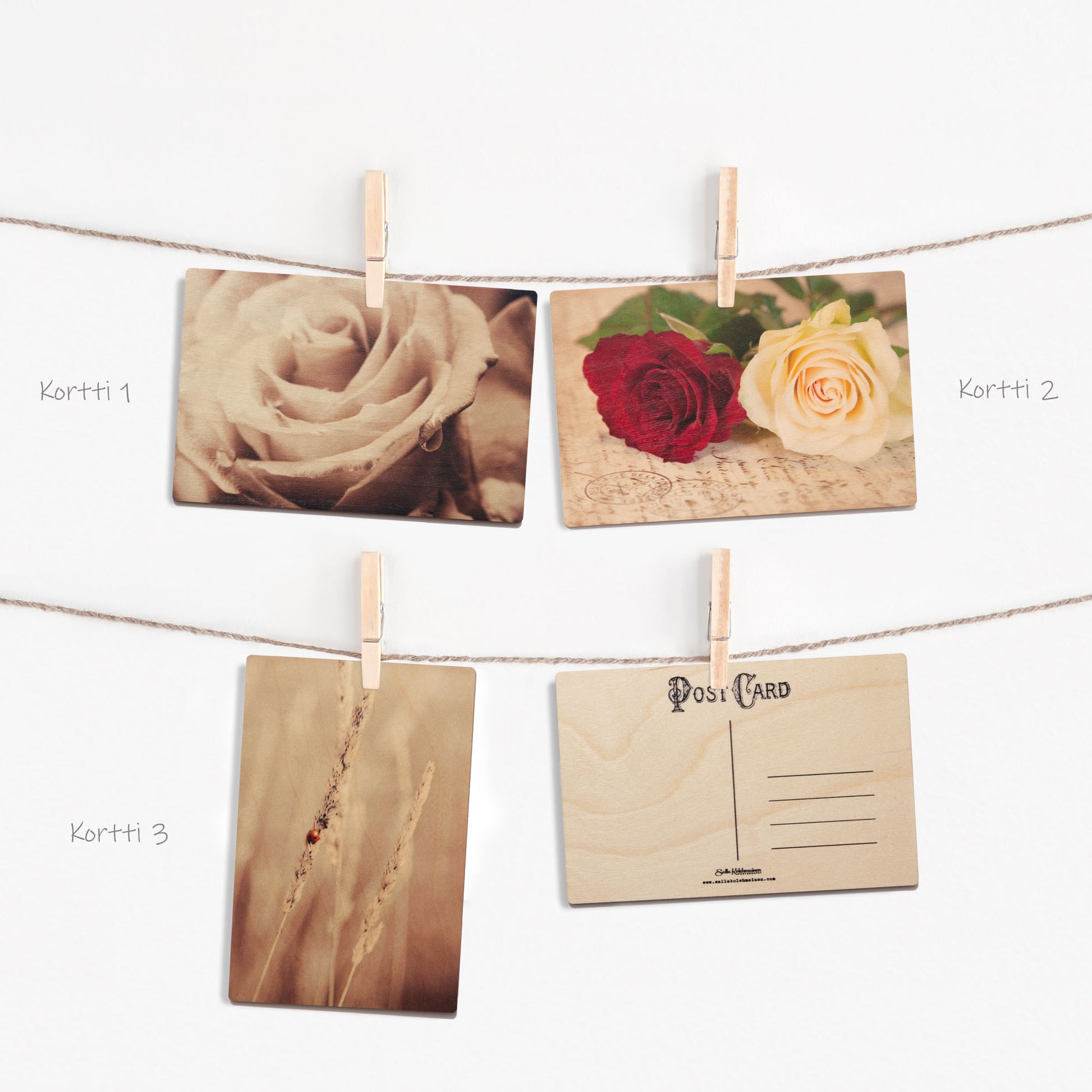 Saatavilla olevat korttimallit löytyvät tuotekuvista, ja jokaisen kortin takaosa on samanlainen; siellä on korttiviivasto sekä vintage tyylinen teksti Post Card.