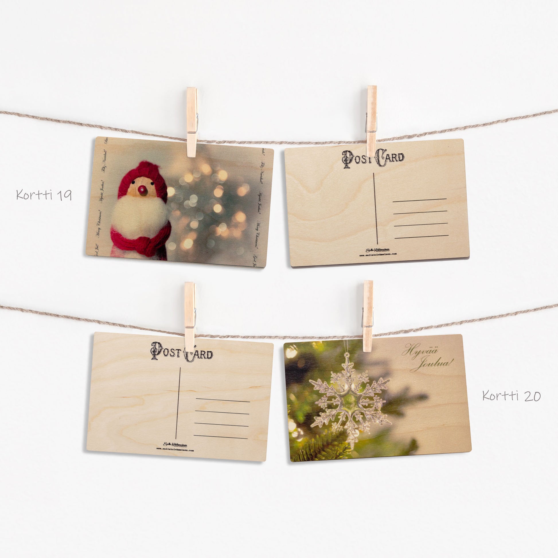 Postikortit ovat valmistettu 3mm paksuiselle koivuvanerille. Kortit ovat siis huomattavasti paksumpia & vahvempia kuin normaali kartongista valmistettu postikortti, ja toimivatkin tämän takia erinomaisesti myös pienenä sisustustauluna.