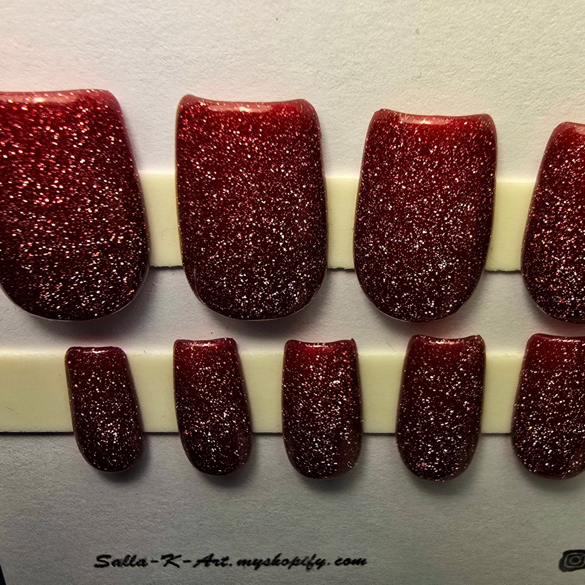 Kynsien väri punainen glitter. Luonnonvalossa kynsien glitter/bling efekti hillitympi, keinovalossa todella säihkyvä.